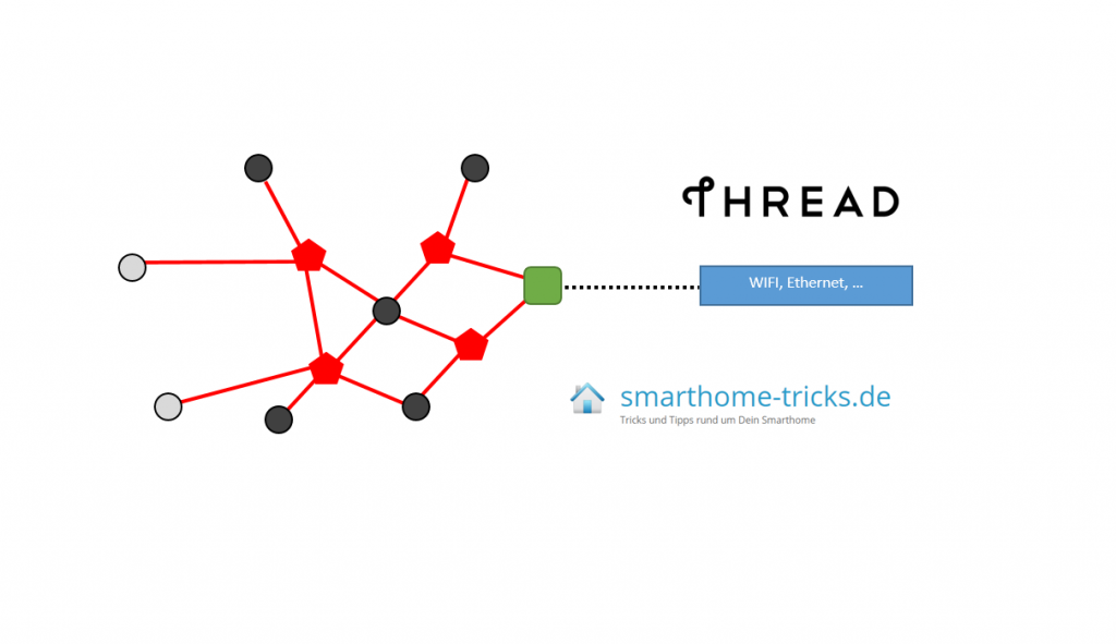 Thread ist ein IP-basiertes (IPv6) Funkprotokoll welches ohne die Verwendung eines speziellen Routers ein Mesh-fähiges Netzwerk zwischen den einzelnen Smart-Home Geräten aufbauen kann. Jedes Thread-Gerät stellt dabei einen eigenen Netzwerk-Knoten dar und verknüpft so alle Geräte miteinander. Die Grundlage des Protokolls stellt 6LoWPAN (IPv6 für WPAN mit niedrigem Energieverbrauch) dar.