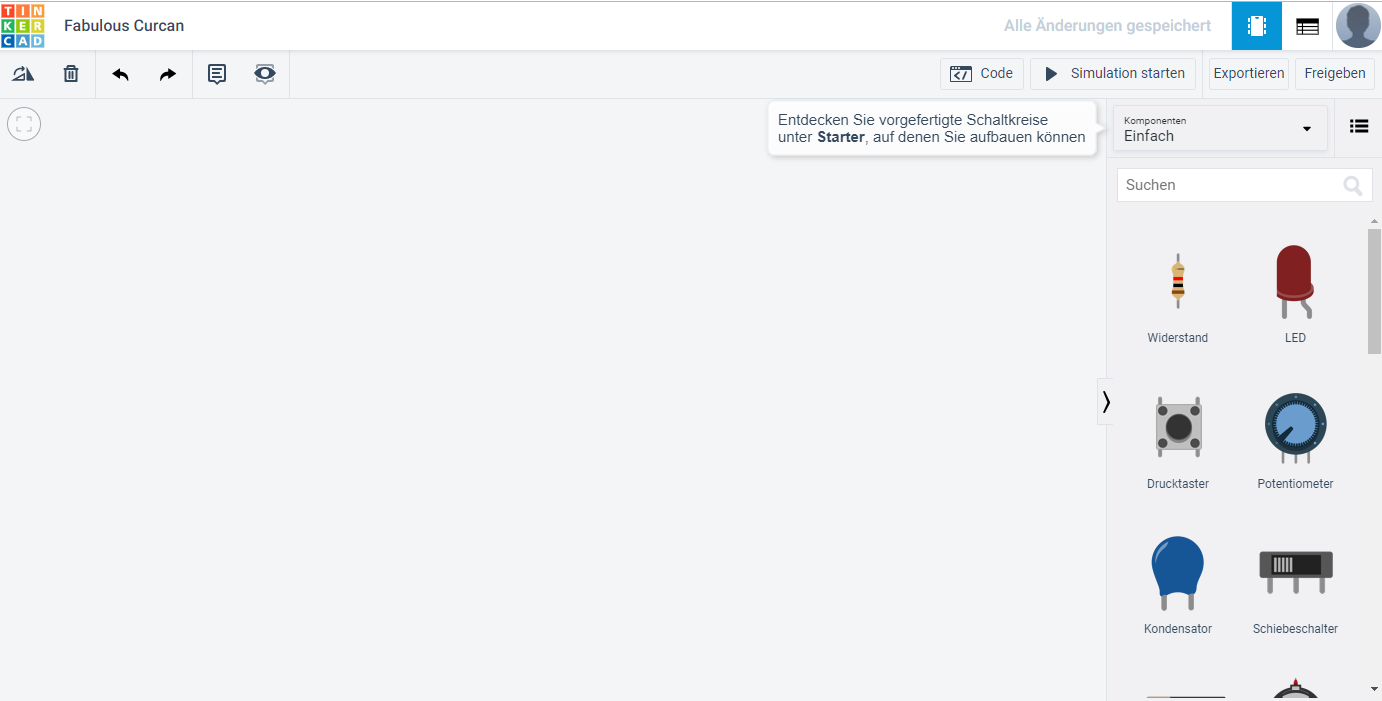 Über die Schaltfläche „Code“ können wir nun die Ansicht zwischen dem Schaltungsentwurf sowie dem Code-Editor wechseln.