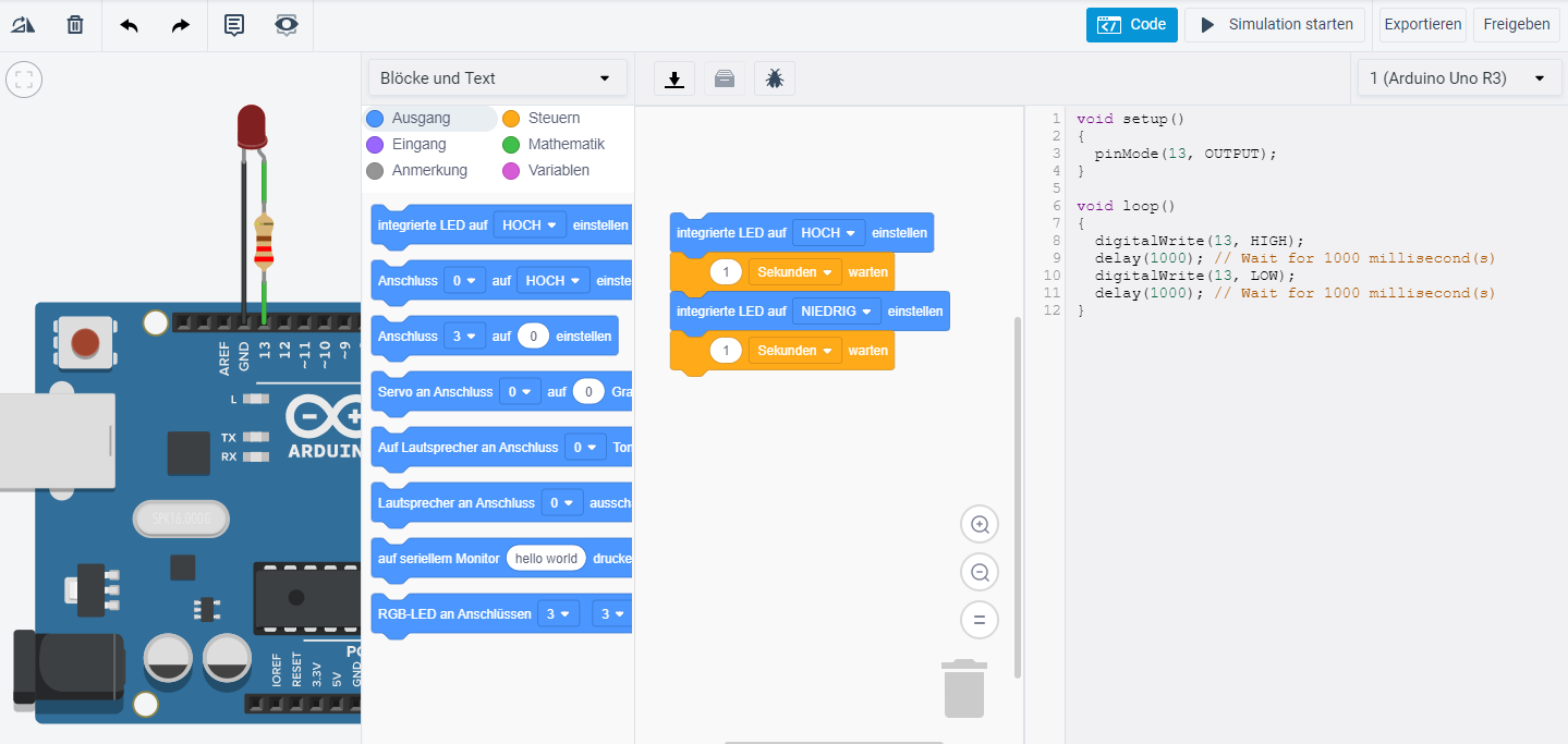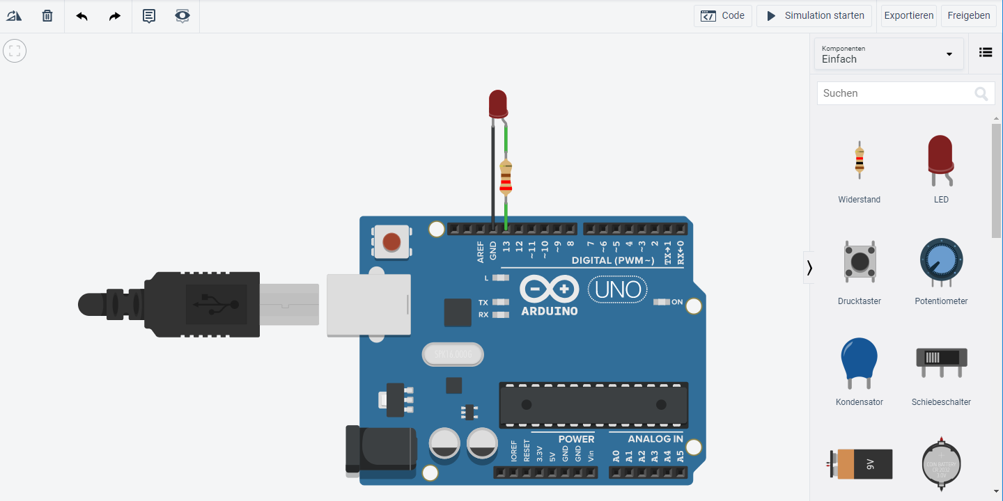 Nach dem wir uns nun mit dem Editor vertraut gemacht haben, können wir im nächsten Schritt den Code auf dem Arduino ausführen. Klicke dazu auf die Schaltfläche „Simulation starten„.