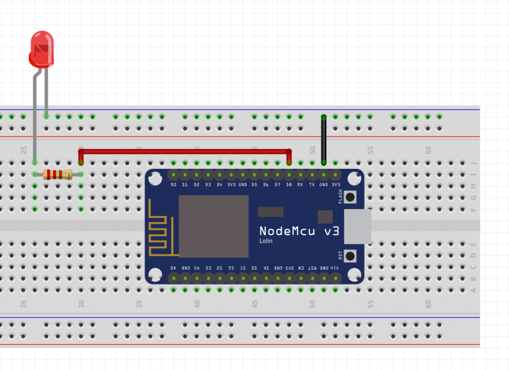 Wir beginnen nun mit dem Aufbau der Schaltung. In meinem Beispiel habe ich die NodeMCU mittig auf das Breadboard platziert. Die LED wird mit dem kürzeren Bein (Minus) auf die blaue Minus-Leiste gesteckt. Das längere Bein (Plus) wird auf dem BreadBoard mit dem Vorwiderstand verbunden. Ich habe hier einen Widerstand mit 220 Ohm gewählt. Den Vorwiderstand verbinden wir dann noch im Anschluss mit dem digitalen Anschluss D8. Die Minus-Leiste habe ich mit GND der NodeMCU verbunden.