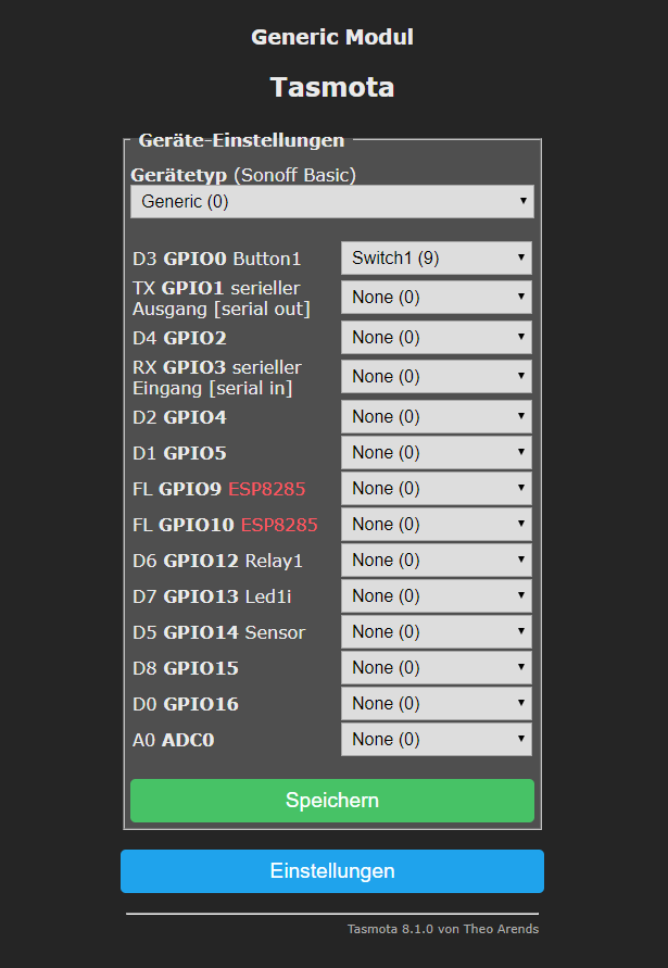Im nächsten Schritt konfigurieren wir das Generic Modul innerhalb von Tasmota. Dazu öffnen wir die Geräte-Einstellungen und wählen am Pin D3 den Typ Switch1 aus.
