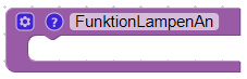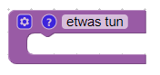 Um eine Funktion zu erstellen öffnen wir zunächst die Liste der verfügbaren Blöcke und klicken auf den Bereich „Funktionen“. Hier können wir nun den Block „etwas tun“ auf das Script ziehen. Der Block besitzt eine Schaltfläche (Zahnrad) für die Konfiguration des Blocks sowie eine Beschreibungs-Schaltfläche (Fragezeichen).