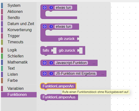 Bevor wir mit den einzelnen Anweisungen der Funktion beginnen, geben wir der Funktion einen sprechenden Namen. Für den Beispiel habe ich den Namen „FunktionLampenAn“ gewählt. Der Namen kann mit einem Klick auf den Text „etwas tun“ eingegeben werden.