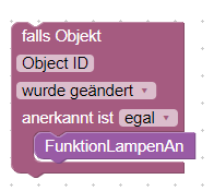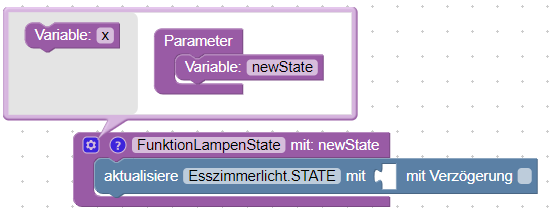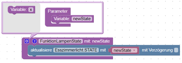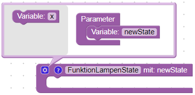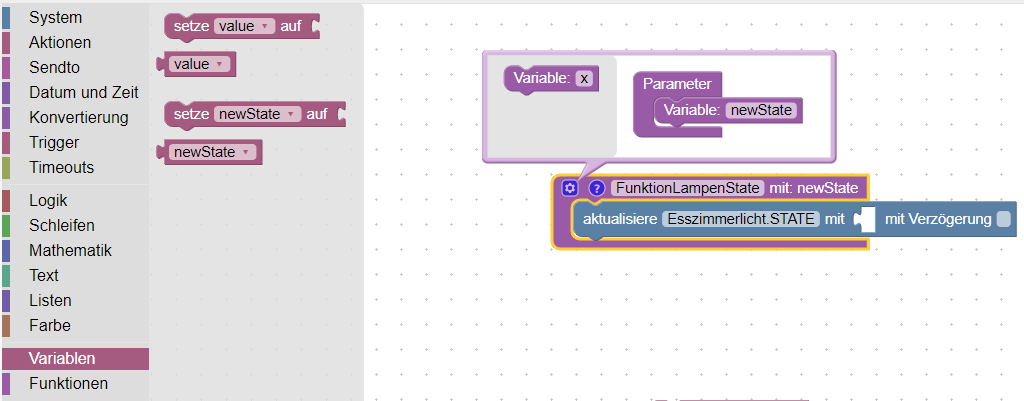 Nun können wir die Funktion aufrufen. Dazu klappen wir die Liste der Blöcke auf und öffnen den Bereich „Funktionen“. Hier ist nun unsere neue Funktion mit dem Parameter „newState“ zu finden. Die Funktion können wir nun in den Ausführungsblock des Triggers ziehen. Nun müssen wir nur noch den Wert des Triggers an den Parameter „newState“ anhängen.