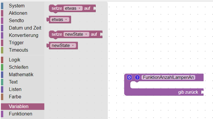 In diesem Kapitel erstellen wir uns nun eine Funktion, welche einen Rückgabewert besitzt. Als Beispiel wollen wir eine einfache Funktion erstellen, mit der wir die eingeschalteten Lampen zählen wollen. Dazu öffnen wir zunächst wieder die Liste der Blöcke und wählen den Bereich „Funktionen“. In diesem Bereich gibt es den Block „etwas tun“ mit dem Zusatz „gib zurück“. Diesen Block ziehen wir uns auf das Script.