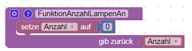 Nun fügen wir aus dem Bereich „Variablen“ den Block „setze .. auf“ ein, mit der wir einer Variable einen Wert zuweißen können. Dazu klicken wir in dem Block auf „etwas“ und wählen in der Liste der Aktionen die Aktion „Variable erstellen“. Im nächsten Schritt geben wir für die Variable einen Namen ein. Ich habe hier den Namen „Anzahl“ vergeben, da diese Variable die Anzahl eingeschalteter Lichter zählen soll. Zu Beginn der Funktion wird die Variable mit Null Initialisiert. Den numerischen Wert können wir aus dem Bereich „Mathematik“ auswählen und an den Block „setze Anzahl auf“ anhängen und mit 0 initialisieren. Zusätzlich müssen wir die erstellte Variable, die nun auch im Bereich „Variablen“ sichtbar ist, noch als Rückgabewert an die Funktion anhängen. Dazu wird die Variable einfach an „gib zurück“ angehängt.