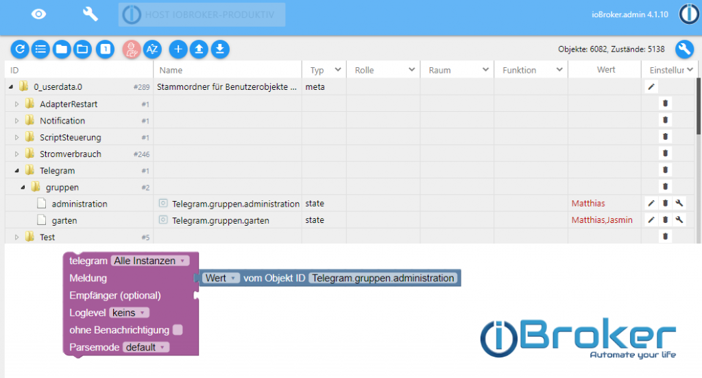 Wir verwenden den Telegram-Bot in unserem Smart-Home als Nachrichten-Zentrale für einige Geräte und Status-Informationen. Zudem versenden wir damit auch wichtige System-Meldungen wie z.B. ausstehende ioBroker Adapter-Updates. Diese System-Meldungen werden dann aber nur an vorher bestimmte Benutzer gesendet. Im Artikel zeige ich Dir, wie Du die Zustellung von Nachrichten über Blockly lösen kannst. Zudem zeige ich Dir, wie Du Nachrichten an bestimmte Gruppen versenden kannst.