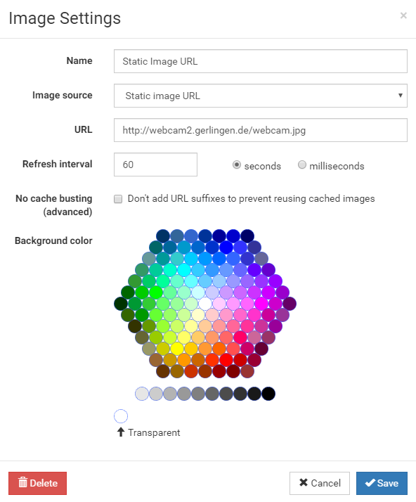 In der Konfiguration können wir den Namen, sowie die Image-Source (Quelle) angeben. In meiner Umgebung hat leider nur der Eintrag „Static Image Url“ funktioniert. Mit dieser Option können wir eine statische Bildquelle (nicht ändernde URL) auf der Visualisierung anzeigen. Ich habe hier das aktuelle Webcam-Foto unserer Stadt gewählt. Über die Einstellung „Refresh interval“ kann die Aktualisierung des Bildes in Sekunden oder Millisekunden angegeben werden. Zudem wird der Bildquelle ein Suffix angehängt, mit dem das lokale Caching umgangen werden kann.