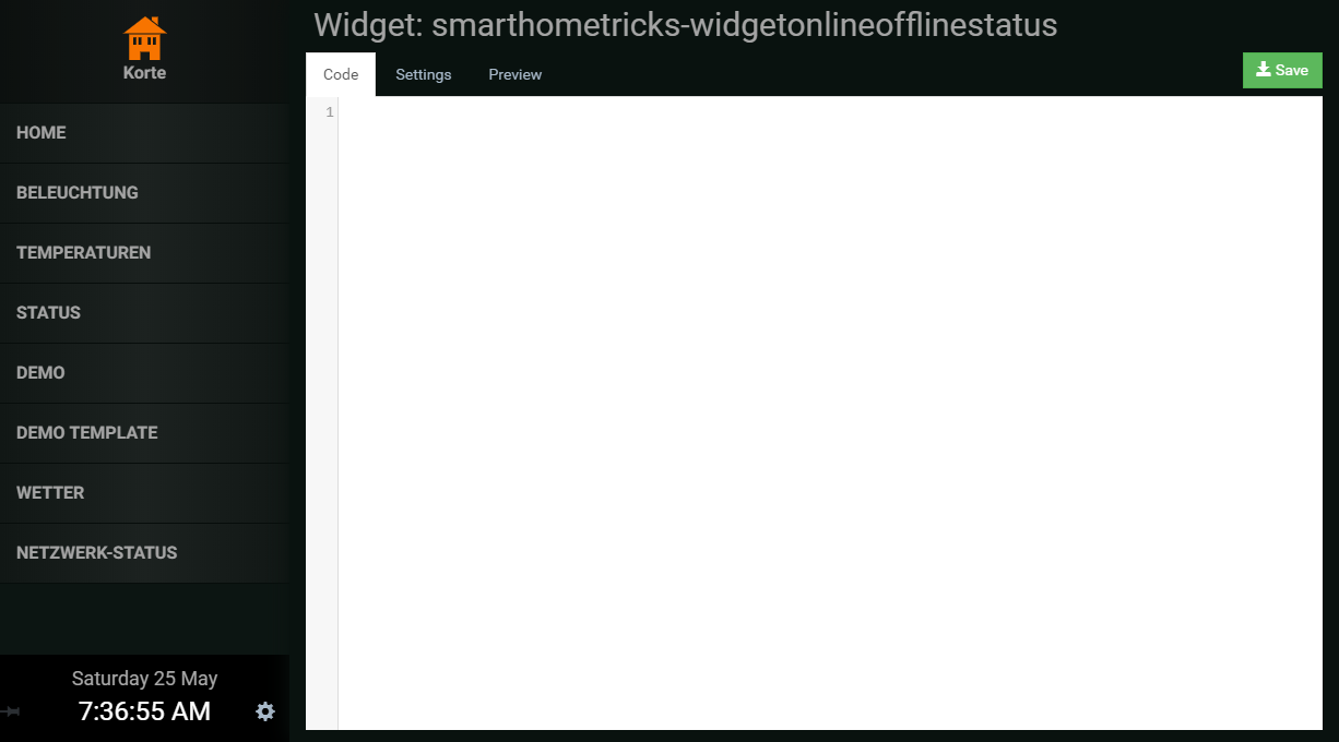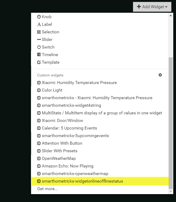 Im nächsten Schritt erstellen wir uns das Widget. Dazu klicken wir im Bereich „Custom Widgets“ auf „New Widget“ und vergeben einen Namen für das Widget. Ich habe als Name „smarthometricks-widgetonlineofflinestatus“ gewählt, hier könnt ihr aber auch einen anderen Namen verwenden.