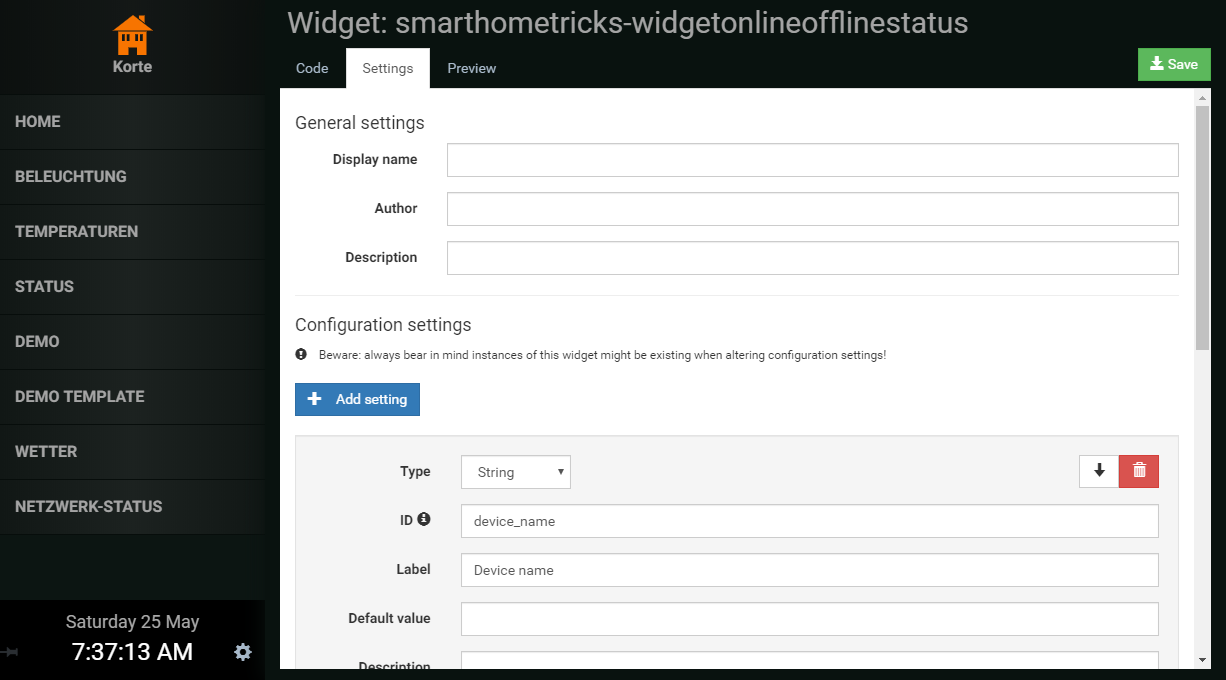 Das Widget wird nun im Konfigurationsmodus geöffnet. Im ersten Schritt wechseln wir nun auf die Tab-Lasche „Settings“ um die benötigten Konfigurations-Felder für das Widget anzulegen. Folgende Einstellungen müssen erstellt werden: