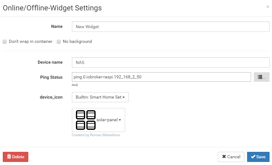 In den Widget Einstellungen können wir nun den Device-Namen, den Datenpunkt mit dem Online-Status (true/false) sowie ein entsprechendes Icon einstellen. Die Datenpunkte wurden aus dem Adapter ping verwendet.