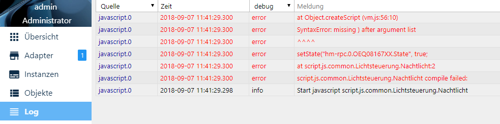 Wenn wir nun den Log-Bereich öffnen sehen wir in der ersten Spalte die Quelle des Fehlers. In unserem Beispiel ist der Fehler im javascript.0 Adapter aufgetreten. In der Meldung des Fehlers sehen wir auch direkt, dass der Fehler in unserer Nachtlichtsteuerung aufgetreten ist.