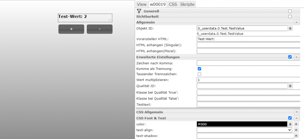 Das erste Widget habe ich nun im ersten Schritt mit Plus Beschriftet. Dazu kann einfach das Feld Text verwendet werden. Zudem müssen wir den zu verändernden Datenpunkt in das Feld Objekt-ID eintragen. Zudem können wir hier den Schritt sowie den maximalen Wert bei einer Plus-Veränderung hinterlegen. In meinem Fall ist das der Wert 100.