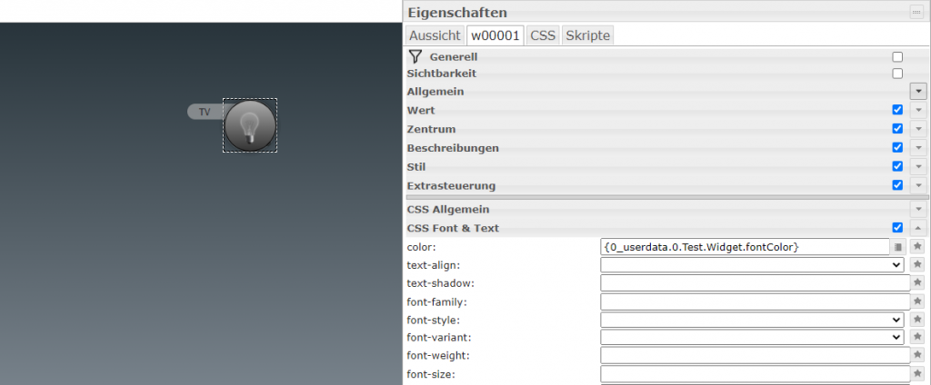 Im nächsten Schritt wechseln wir in die Bearbeitung der VIS-Visualisierung und fügen am Widget im Bereich CSS Font & Text – color das folgende Object Binding ein: