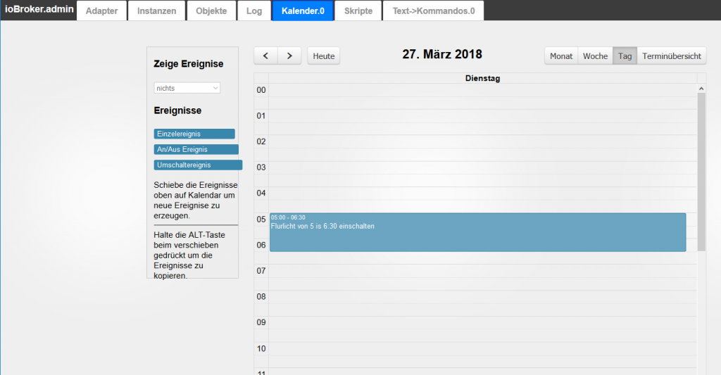 Als Ereignis-Typ wähle ich daher auf der linken Seite das Ereignis „An/Aus Ereignis“ und ziehe das blaue Ereignisfeld in den Kalender auf die entsprechende Uhrzeit, an dem das Ereignis beginnen soll. Per ziehen des Ereignisses kann der Start und das Ende einfach im Kalender bearbeitet werden.