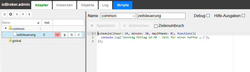 Hallo Matthias, zunächst einmal herzlichen Dank für deine vielen Beiträge zum ioBroker, haben mir schon sehr geholfen. In diesem Beitrag hat mir ein kleiner Fehler allerdings viel Kopfzerbrechen gemacht, bis ich die richtige Schreibweise heraus hatte. Du hast dort im ersten Programm den Aufruf schedule({hour: 20, minute: 15}, RunDailyScript();}); Das ist falsch, es müsste lauten schedule({hour: 20, minute: 15}, RunDailyScript); d.h. hinten sind vier Zeichen zu viel „();}“. Herzliche Grüße, Martin
