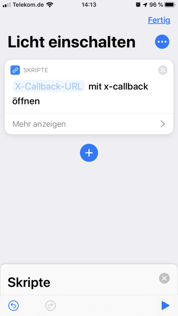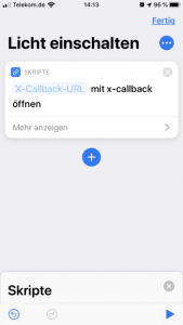Dazu starten wir im nächsten Schritt auf unserem iPhone die App „Kurzbefehle“. In der Übersicht „Meine Kurzbefehle“ können wir mittels der Plus-Schaltfläche einen neuen Kurzbefehl hinzufügen. Im ersten Schritt gebe ich dem Kurzbefehle einen Namen „Licht einschalten“. Zudem können wir über die Icon-Schaltfläche links neben dem Namen noch ein Icon sowie eine entsprechende Hintergrundfarbe definieren. Im nächsten Schritt können wir das Widget optional noch auf dem Home-Bildschirm ablegen. Dann klicken wir auf „Fertig“ um den Kurzbefehl zu speichern. Jetzt können wir die eigentlichen Aktionen hinzufügen. Über die Schaltfläche „Aktion hinzufügen“ öffnet sich nun die Liste mit den vorgeschlagenen Aktionen. Scrolle hier bis zum Bereich „X-Callback“ herunter. Im Bereich „X-Callback“ wählst Du nun die Aktion „X-Callback-URL öffnen“. In der Konfiguration des X-Callback gibst Du nun die entsprechende URL des Adapters „Simple API“ ein.