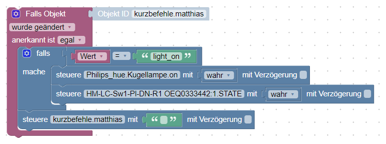 Nach dem wir jetzt die Aktion in den Datenpunkt schreiben können „light_on“, können wir im nächsten Schritt z.B. via Blockly-Script auf Veränderungen des Datenpunktes reagieren. Im folgenden Script habe ich dazu einen Trigger eingefügt, welcher den Datenpunkt auf Veränderungen überwacht. Bei einer Veränderung des Datenpunkts wird der Trigger ausgelöst und über den „Falls-Block“ können die verschiedenen Werte ausgewertet werden. Ich habe hier auf den Wert „light_on“ abgefragt und dann die entsprechenden Leuchtmittel per Steuere-Block auf „wahr“ gesetzt.