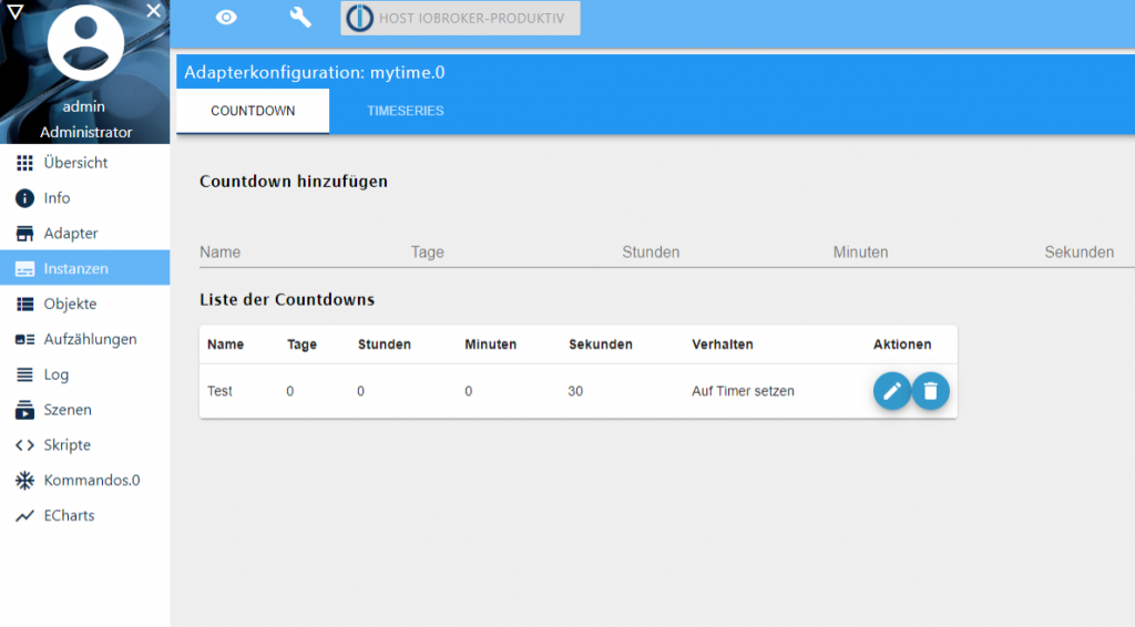 Nach der Installation des Adapters wechseln wir in die Instanzen und beginnen hier mit der Konfiguration des Adapters. Für mein Beispiel habe ich nun einen neuen Countdown mit einer Zeitangabe von 30 Sekunden angelegt.